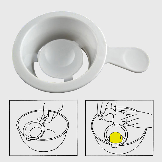 將打開的蛋倒入分離槽中,輕輕搖晃數下即可分離蛋白與蛋黃,蛋白會流下到打蛋盆內,蛋黃則完整地留在分離器中央,使用方便。用途廣泛,不論是煮食、做蛋糕、還是做餅等,都用得著它。(還可以把分出來的蛋白做面膜美容!)