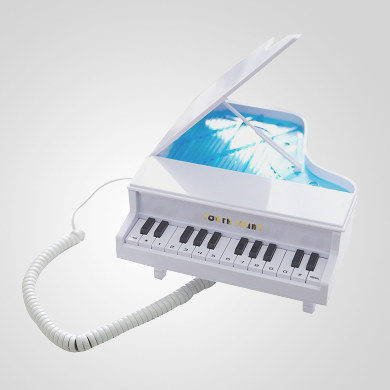 精緻鋼琴造型的有線電話。有來電和打電話時,LED燈會閃亮。有重撥REDIAL功能。